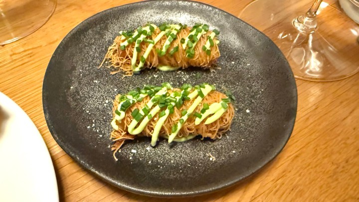 The amuse bouche was salsify in crispy kataifi pastry with chive mayonnaise. Very well executed: very crispy, the pastry did not overpower the salsify, and the chives provided a fresh accent.