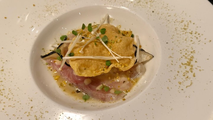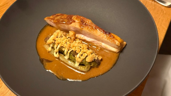 The appetizer was hamachi (kingfish) ceviche with black radish ravioli, and “Tom Ka Pla” sauce. The latter is coconut milk with lemongrass, galangal, and kaffir lime leaves, but without the chillies. Five spice powder was sprinkled at the rim of the plate, to add to your liking. The fish was served at room temperature and the sauce had a mild but delicious flavor. White Burgundy with Thai food is not a usual pairing, but by leaving out the chilies, it worked very well.