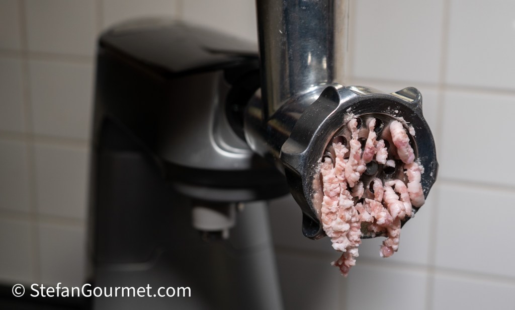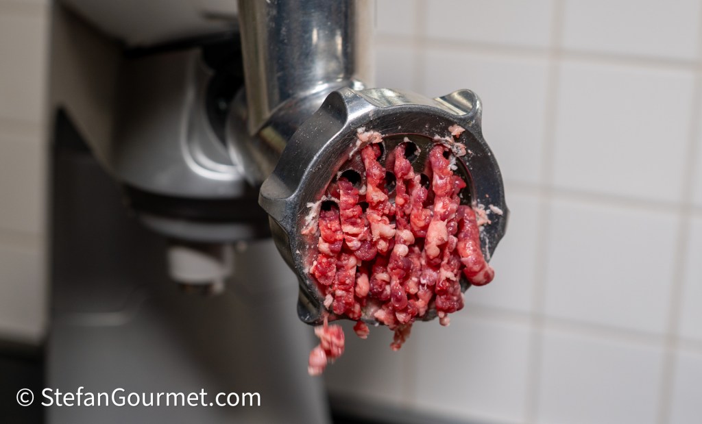 Grind the beef as well, coarsely. Store-bought ground beef is often ground finely and you do not know what cuts were used. This is why I prefer to grind my own. I used chuck in this case.