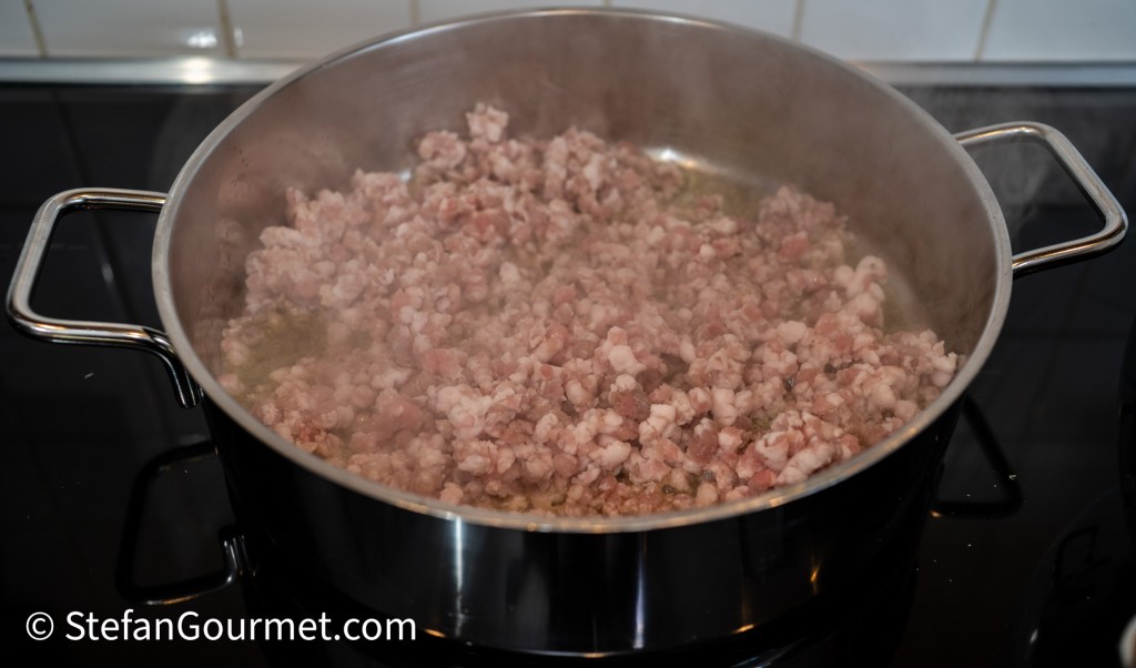 • Comments: It is interesting that the cured pancetta of 1982 is now substituted by fresh pork belly, although cured pancetta is still allowed. I personally prefer to use cured pancetta, as it adds more depth of flavor. But for this batch I have used fresh pork belly.
