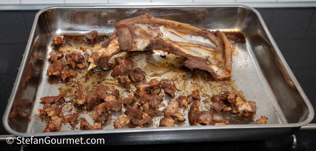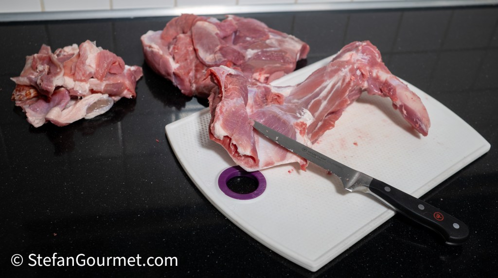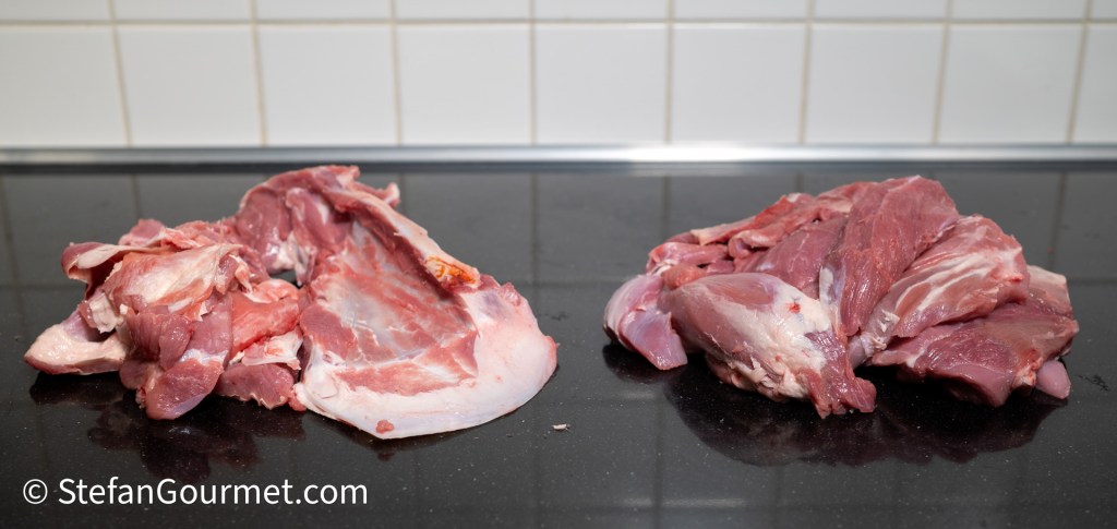 You should also trim the outer layer of fat and connective tissue. Reserve all the bones and trimmings for the stock. You could also ask your butcher to do this for you. I ended up with about 1.25 kilos of meat and 0.75 kilos of bones and trimmings from my 2 kilo lamb shoulder.