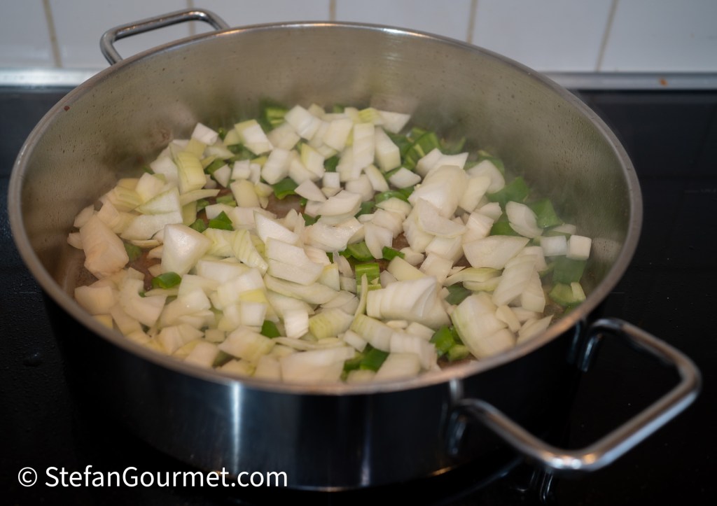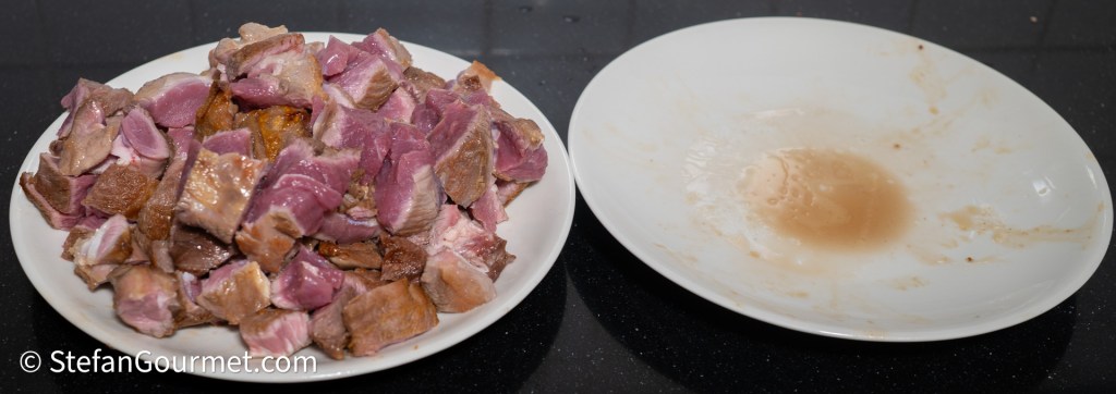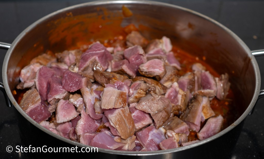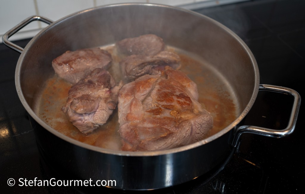 Brown the meat on both sides in a wide, low, thick-bottomed frying pan in olive oil over high heat. If you make the stock first (see below) or you have reserved lamb fat in your freezer from a previous time of making this recipe, it is even better to use that lamb fat for browning the meat. This will greatly enhance the lamb flavor. Of course you should not do that if you don’t like the taste of lamb (but why would you make this recipe then?!). Do not crowd the pan and brown the meat in batches as needed, placing the pieces that are finished on a plate to cool off. Allow the meat to cool off, first to room temperature, and then (covered with plastic wrap) in the refrigerator.