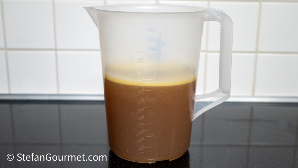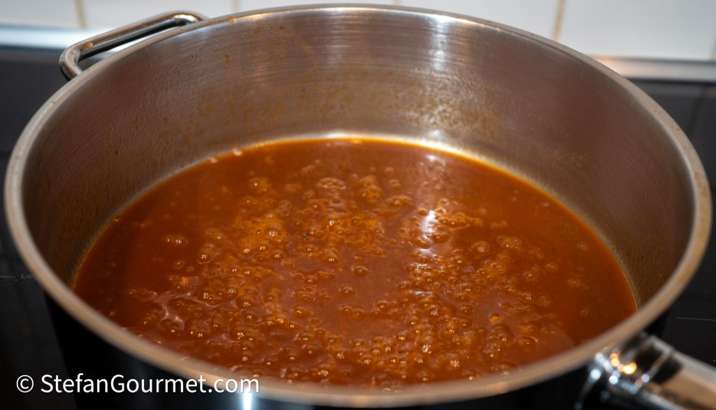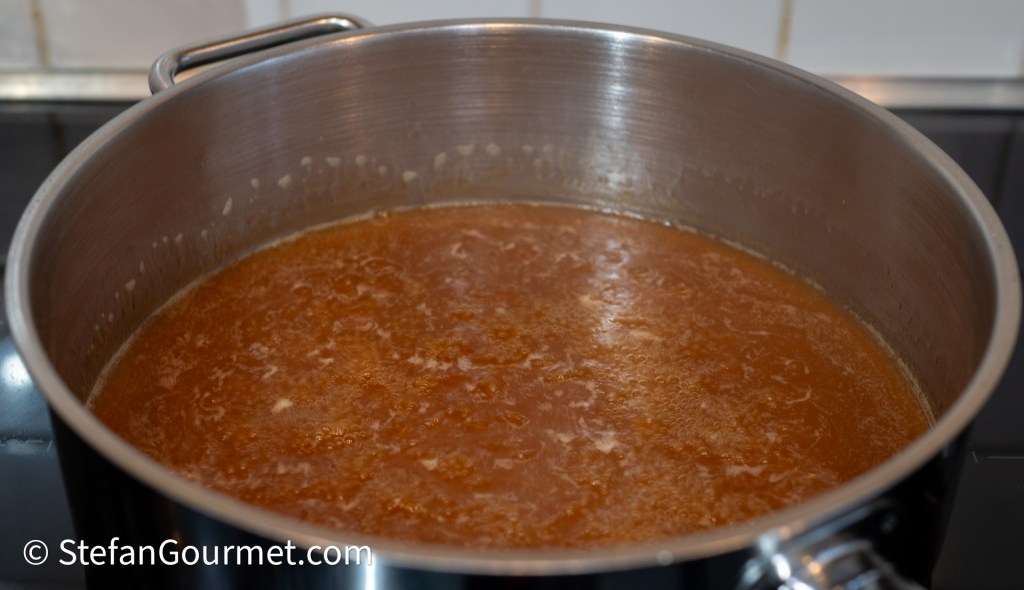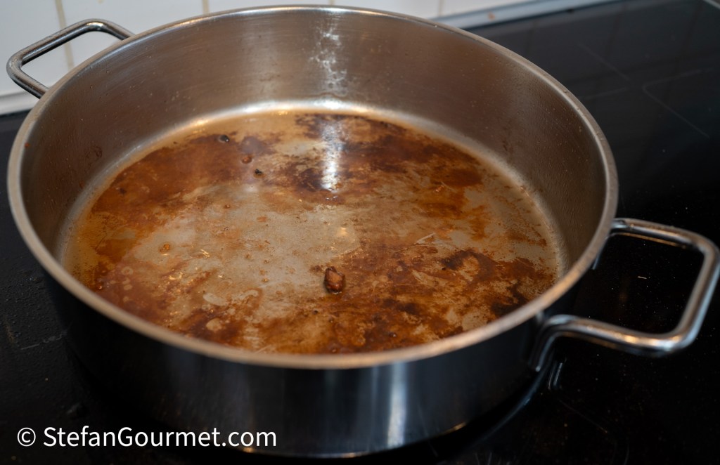 …until it has been reduced to demi glace consistency. Reserve the reduced stock until the sous vide cooking has finished. If you are cooking the stew the traditional way on the stovetop, then use the stock to cover the meat without reducing the stock first.