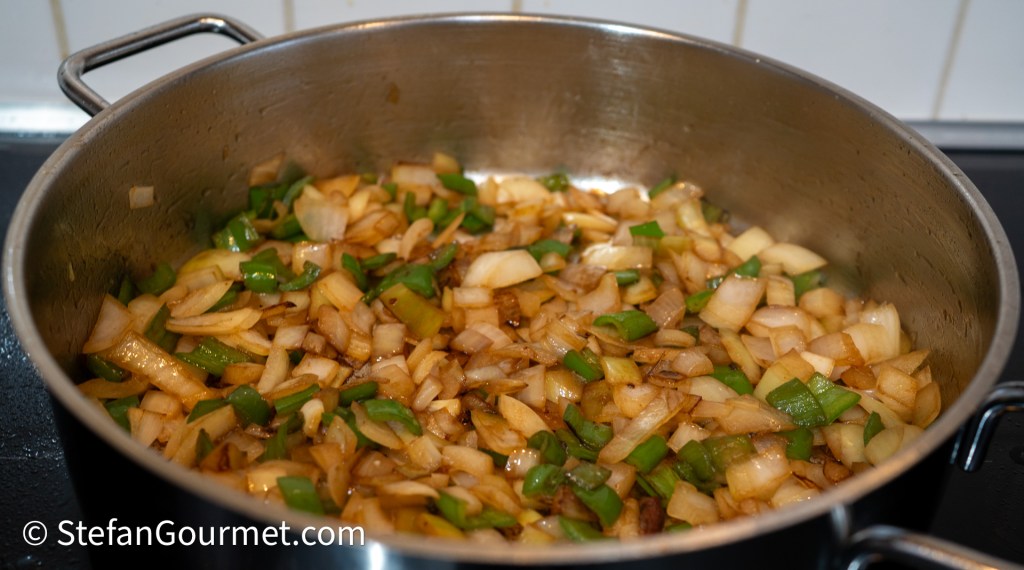 Add the onions and peppers to the pan with the drippings, adding more olive oil if needed. Season with a bit of salt.