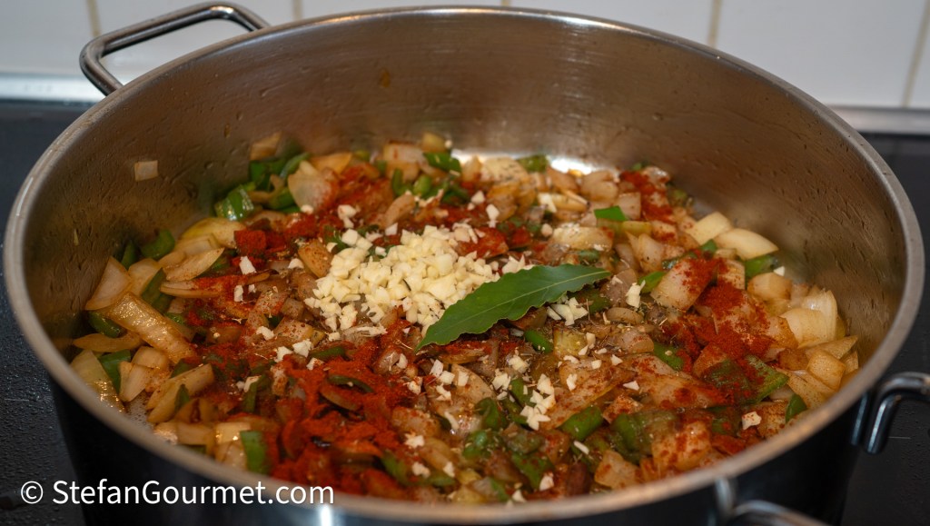 Now add the bay leaf, minced garlic, 1/2 Tbsp of smoked paprika, 1/2 tsp of dried thyme, and 1/2 tsp of dried oregano.