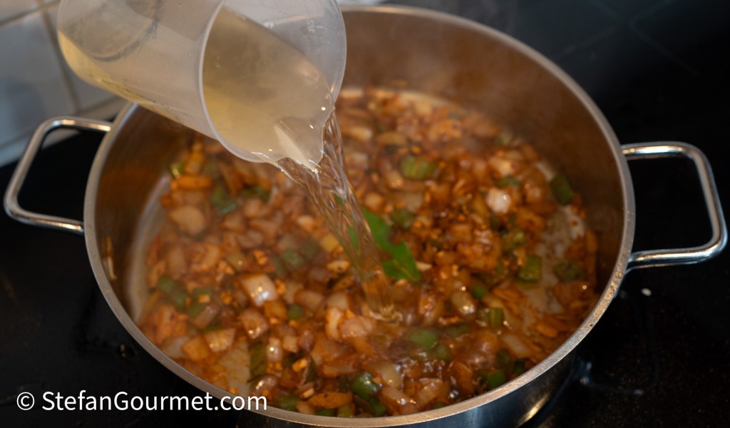 Stir briefly until the garlic starts to color just a little (only very little), and then deglaze the pan with 300 ml of white wine. Allow the wine to reduce over medium-high heat.