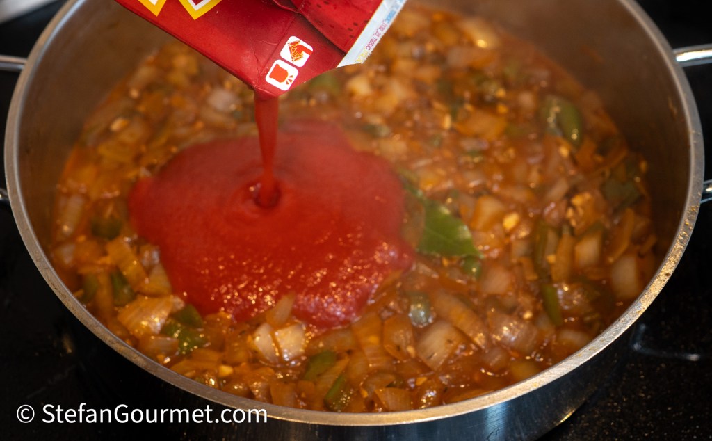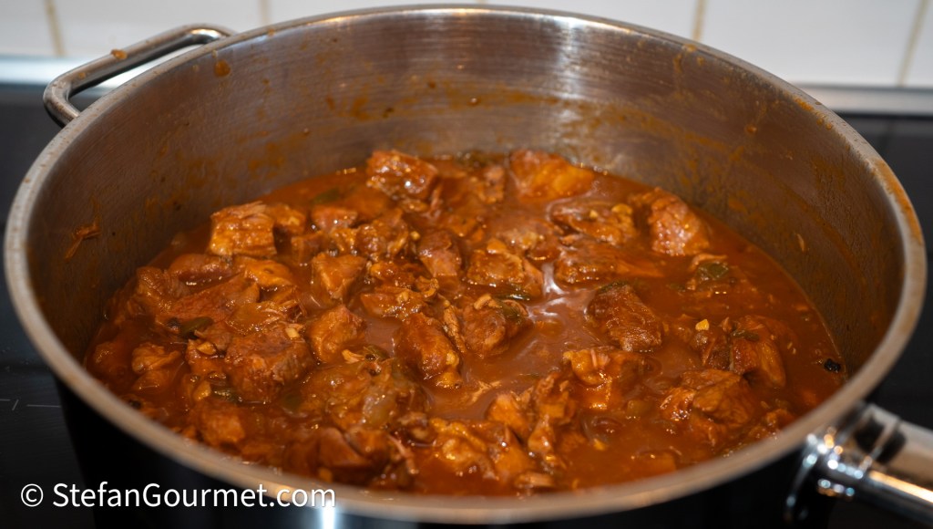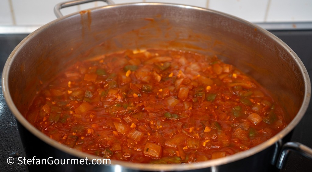 Stir and allow to reduce over medium heat until the sauce has thickened. If you stir, you should not see any water ‘leaking’ from the sauce. Turn off the heat when you’ve reached that state. Taste and adjust the seasoning with salt and spicy smoked paprika.