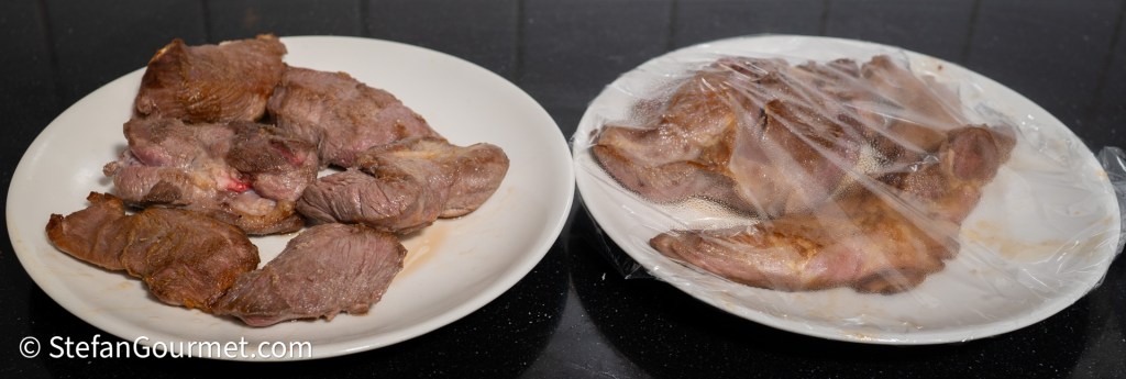 …cut the meat into bite size pieces. The meat should still be raw inside. Add any juices on the plate that have leaked out of the meat to the sauce, as we don’t want to waste any flavor.