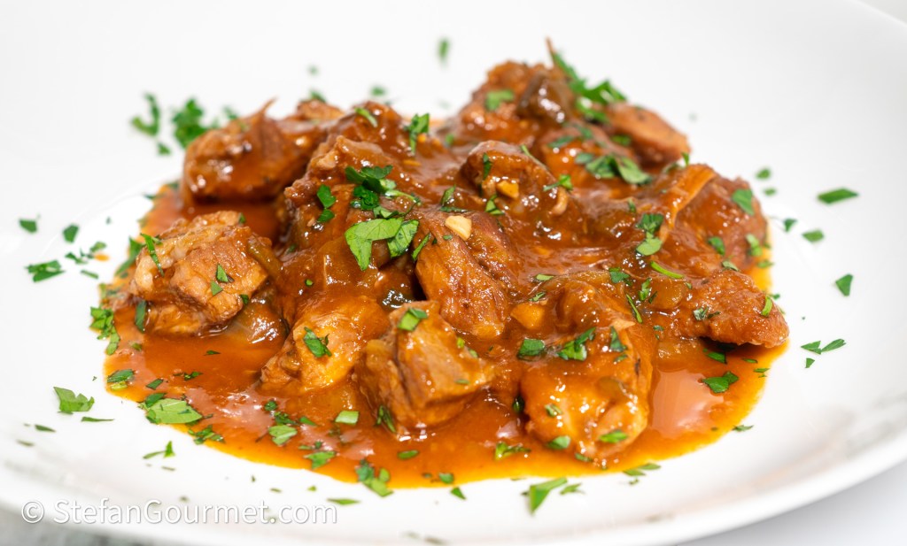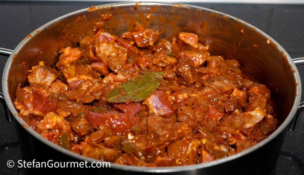It’s been a while since I’ve prepared a recipe I discovered through another blog. But when I saw Frite de Cordero on Accounting for Taste, I immediately knew I wanted to prepare a sous vide version of it. Frite de Cordero is a traditional Spanish lamb stew for which there are many recipes. The main characteristic is that it is flavored with pimentón, Spanish smoked paprika. Just like Accounting for Taste, I’ve used the recipe from the Spanish newspaper El País as my guide. I like using sous vide for stews, as you don’t have to monitor it, and it will always come out perfect. The recipe calls for boneless lamb shoulder, but since I bought the lamb shoulder with the bone, I used that to make a stock, which I reduced and added to give the dish even more flavor and richness. You could of course omit that extra step, but I think it’s definitely worth it. When making this on the stovetop instead of sous vide, make the lamb stock first, and then use it to cover the meat when stewing it.