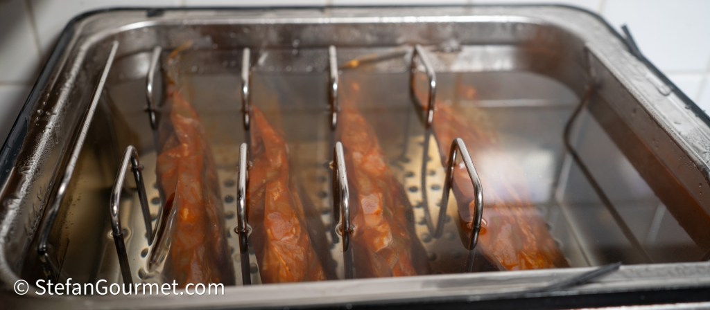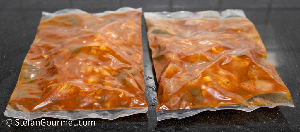 Vacuum seal the meat with the sauce. This is easy with a chamber vacuum machine. If you have an external vacuum sealer, it will probably be necessary to chill the meat with the sauce some more in the refrigerator before you can vacuum seal it without sucking the sauce out of the bag. It is easiest to do this after you’ve transferred the meat with sauce into the bags. Just fold them closed and refrigerate them. (If you left the sauce too thin, you may even have to partially freeze the bags first.)