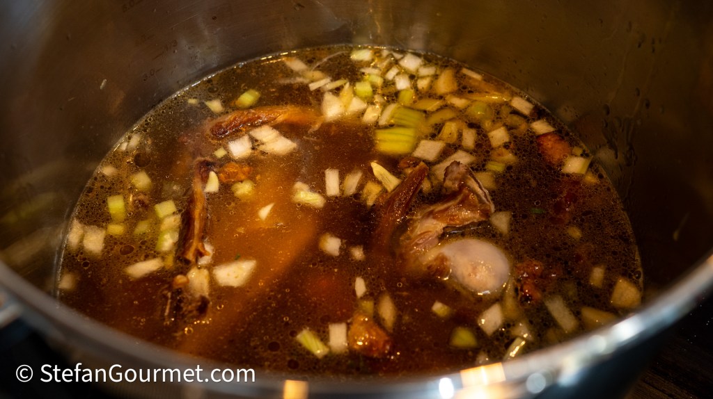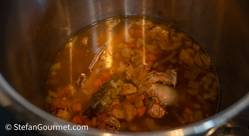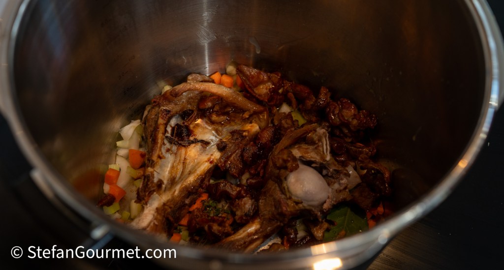 Add the water from the roasting tray to the stock pot or pressure cooker. Add just enough additional cold water to barely cover everything.