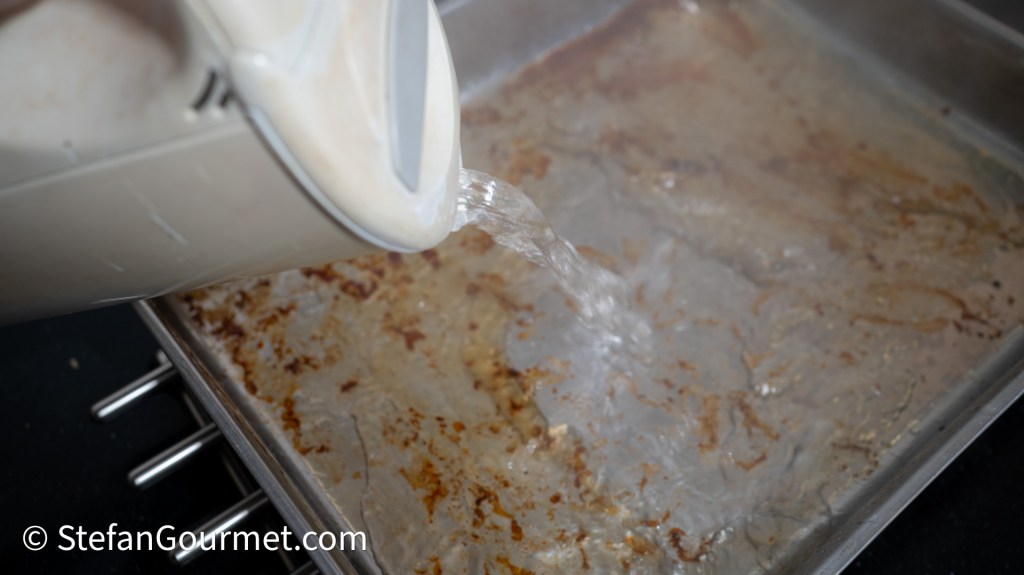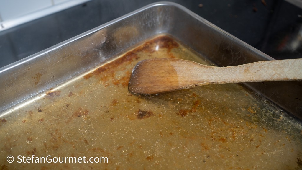 Deglaze the roasting tray with 0.5 to 0.75 litres (2 to 3 cups) of boiling water.