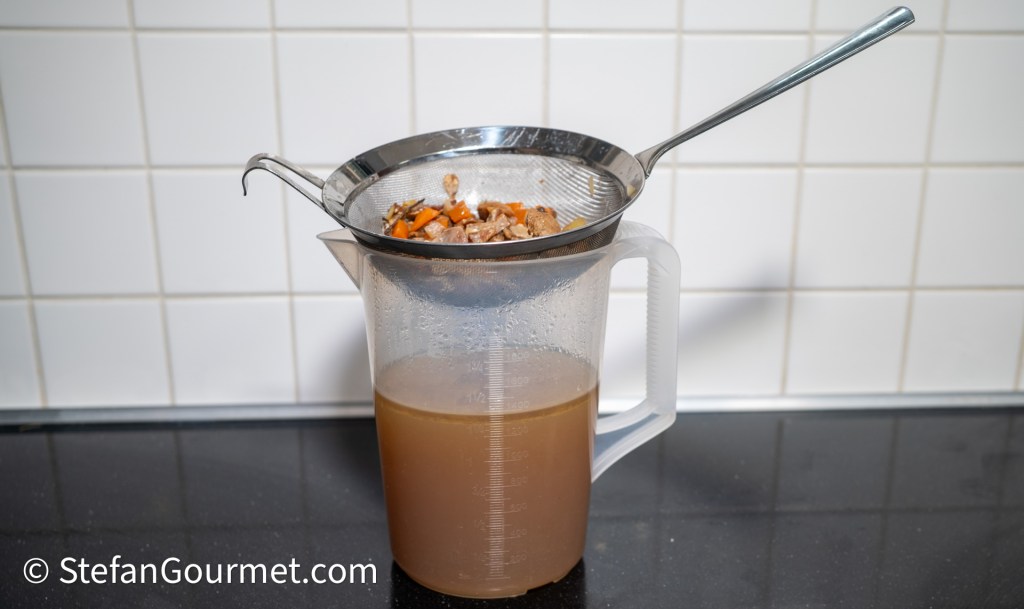 Strain the stock through a fine sieve, and discard the solids.