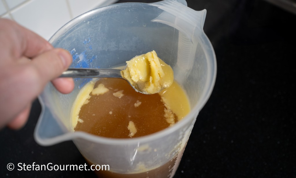 Allow the stock to cool completely. A solid layer of fat will form on top.