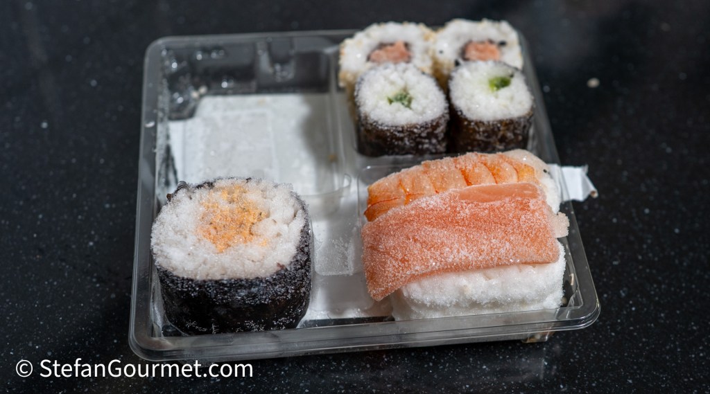 I’ve always thought that sushi could only be eaten just after it was prepared, as the raw fish needs to be refrigerated to keep it fresh, whereas the rice will be ruined if you refrigerate it. Both the texture and the flavor of sushi rice will turn into cardboard from refrigeration. So I only prepare sushi when I know I can eat it straight away, and I only eat sushi where it is prepared to order and served straight away. And I never used to eat supermarket sushi, which is of course refrigerated.