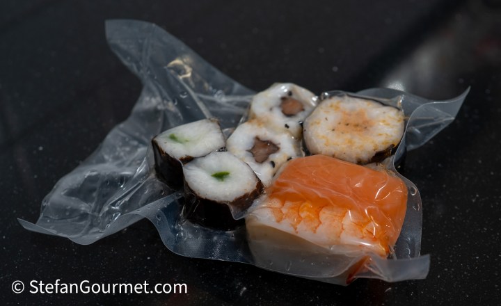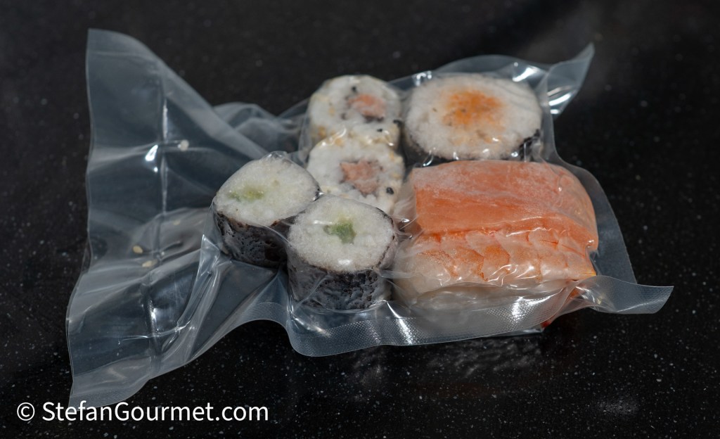 The first problem I had to solve was how to vacuum seal it without squishing the sushi. That was easy — just freeze for 24 hours…