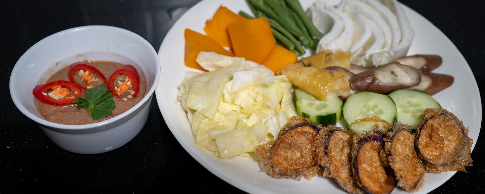 To prepare the deep-fried eggplant, simply dip slices of Thai eggplant in beaten egg and deep fry them in oil at 180C/350F until golden.