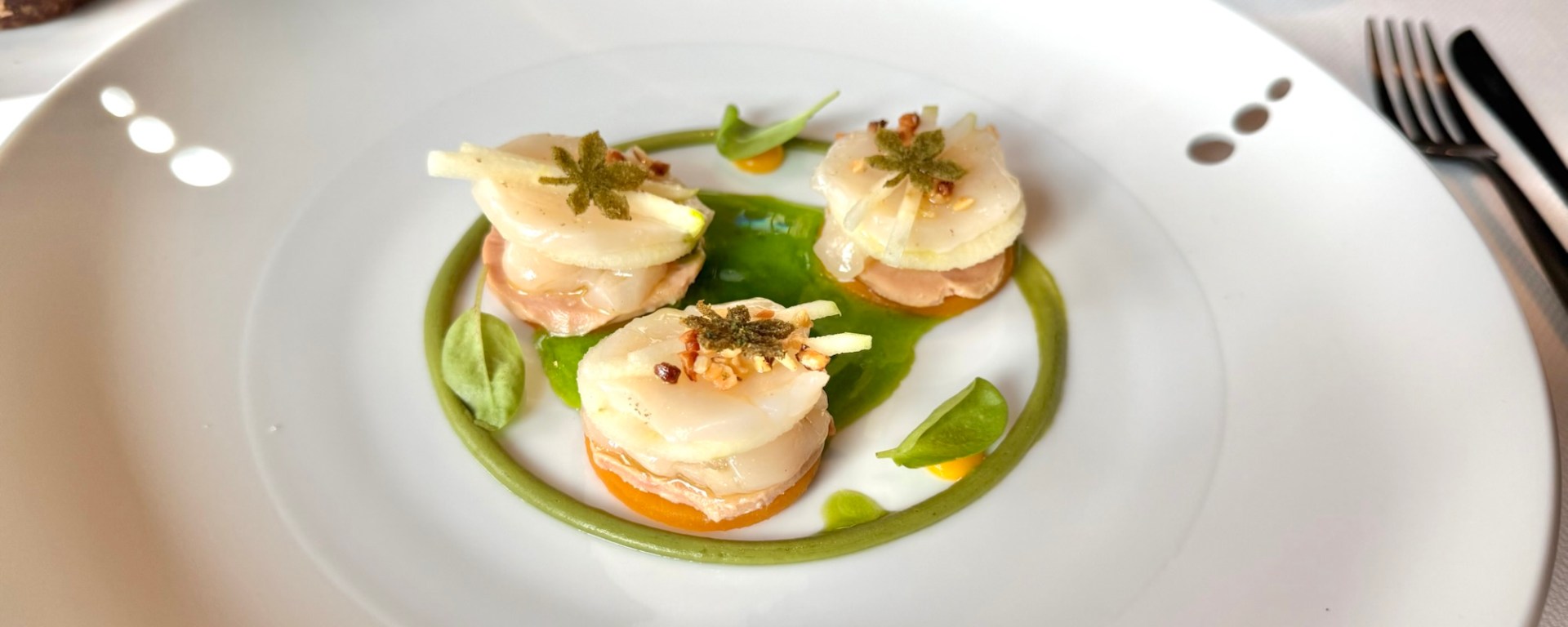 We had discussed the pairing with the sommelier and he suggested we pair something else with the third course. We decided to have half glasses of the regular pairing for this dish, a white Rioja, and the premium pairing, a Pícaro del Aguila Viñas Viejas Clarete 2022 from Ribera del Duero (Spain). The latter is a field blend of many different red and white grape varieties, with Tempranillo and Albillo the most important ones. All the grape varieties are cofermented together and aged for 16 months in oak barrels. It is called “Clarete” (claret) rather than rosé and it has a darker color than the popular rosé from Provence. The wine had great body, aroma, balance, and complexity.