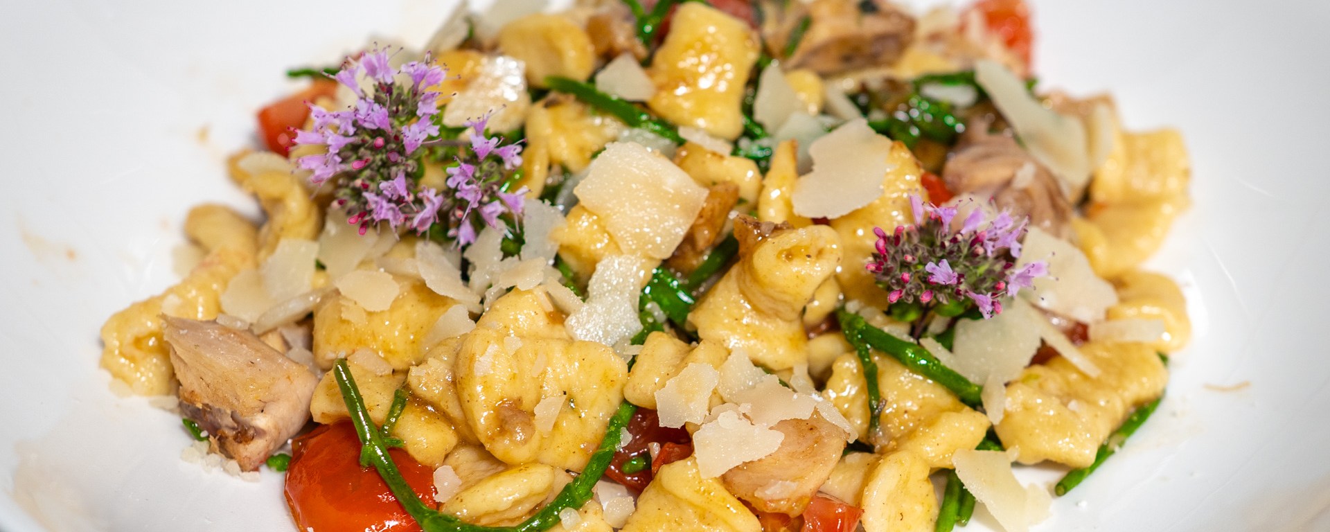 What an inviting-looking dish! I DO wish both rabbit and samphire would not be so difficult to get where I live! And yet the country is overburdened with the animals! Both Hungarian nokedli and csipetke come to mind looking at your girini – my Hungarian ex always made his thru’ the colander – perchance ours had bigger holes . . . perchance your ‘bits’ are somewhat bigger . . Am smiling – the oregano flowers do make the dish look ‘festive’ . . .