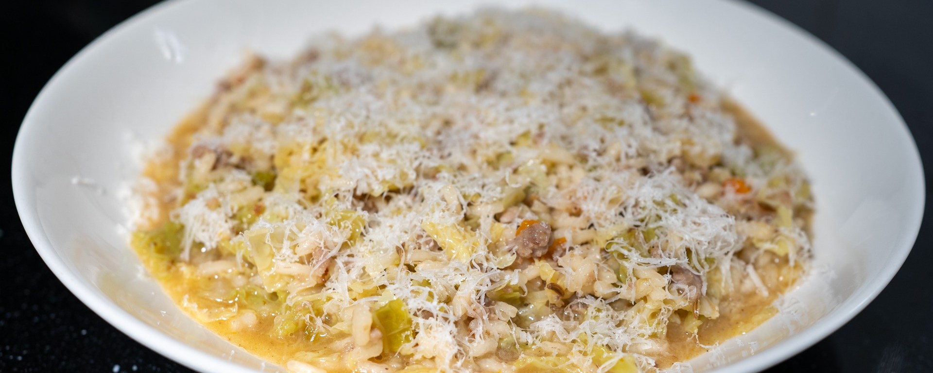 Use a large, wide pan with a thick bottom for even heat distribution—essential for risotto. For this recipe, choose an extra-large pan to accommodate the initial volume of cabbage, which will shrink as it cooks.
