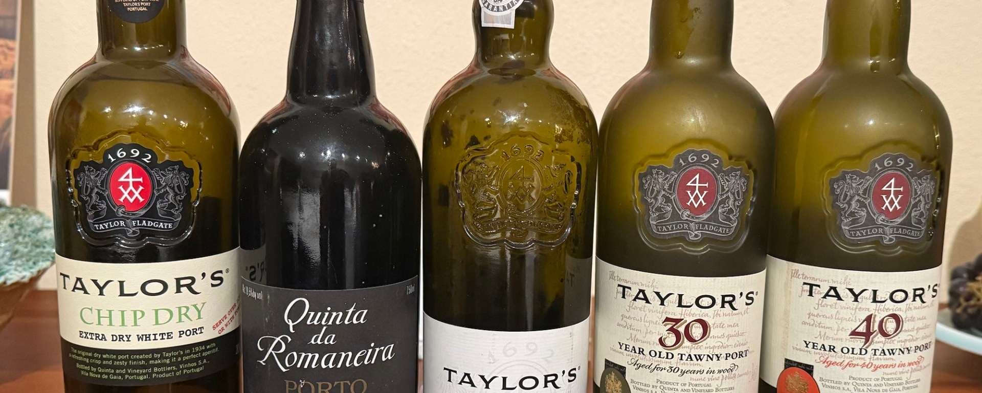 Five bottles of Taylor's port wine, including Chip Dry, Quinta da Romaneira 1994, Vintage Port 2007, 30 Year Old Tawny Port, and 40 Year Old Tawny Port, displayed on a wooden surface.