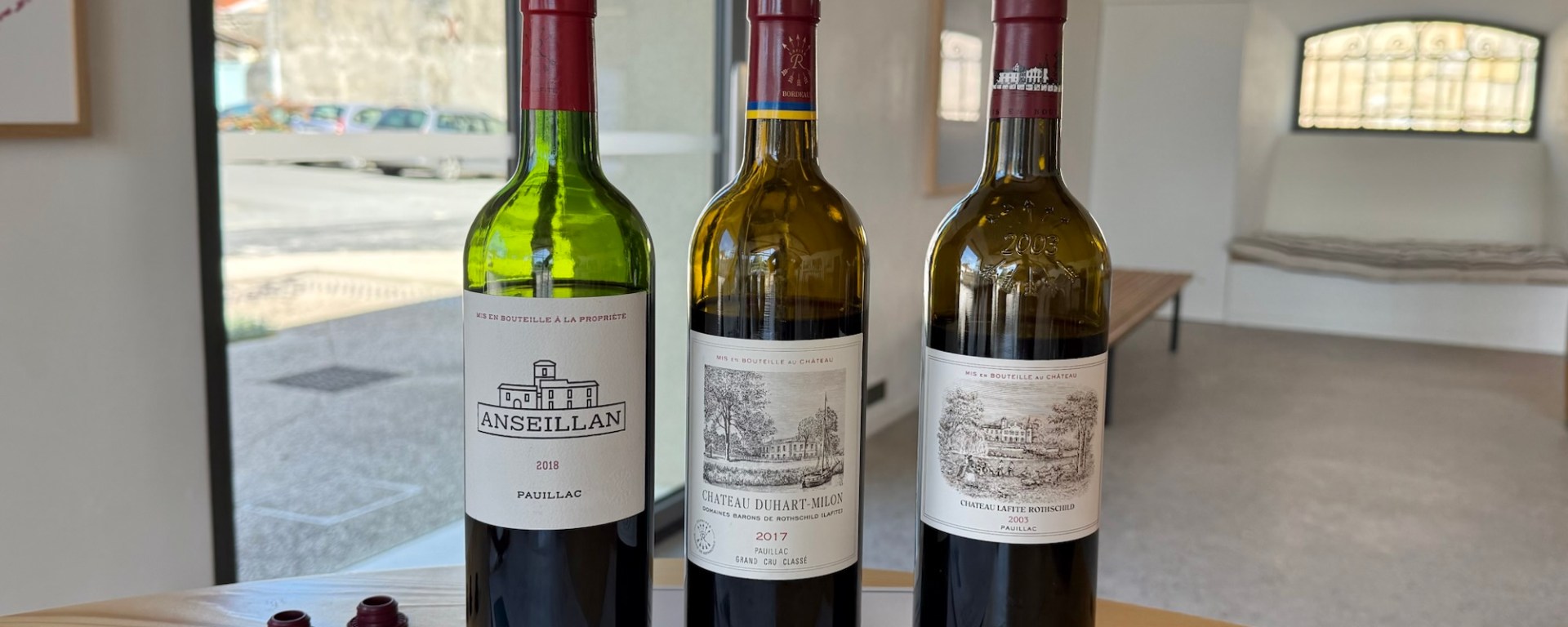 Three wine bottles displayed on a table, with labels showing different vintages: a green bottle labeled 'Anseillan 2020', a brown bottle labeled 'Château Durfort-Vivens 2017', and another brown bottle with a vintage design.