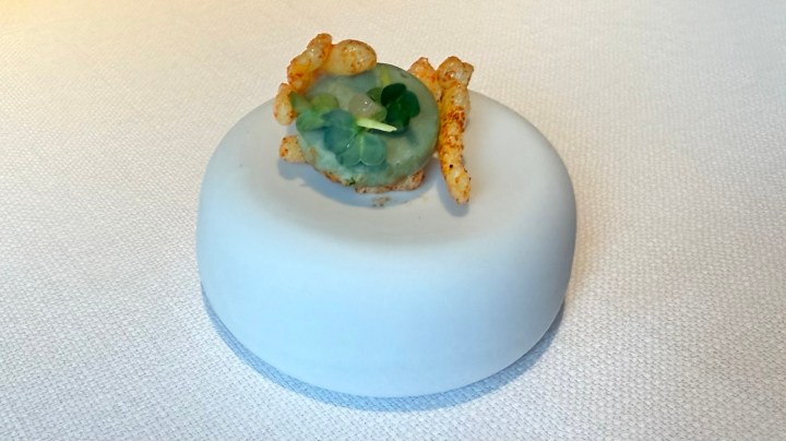 The first amuse bouche was a meringue topped with fatty tuna sashimi, blueberry and shiso.