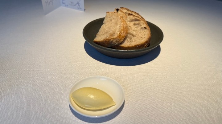The bread was served with what was described as “beurre noisette.” Typically, this is butter heated until it attains the distinct color and aroma of hazelnuts. In this case, the profile seemed very close to regular butter, which left me curious. When I asked about it, a sous-chef kindly came to the table to explain their process: they prepare a beurre noisette in the kitchen, filter out the browned milk solids using a cheesecloth, and then mix the remaining fat with regular butter before whipping it.