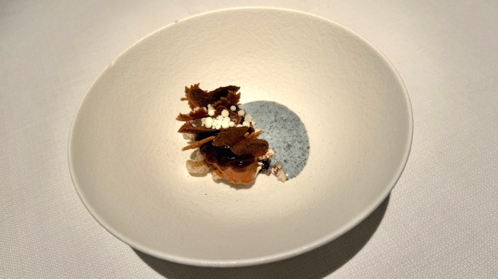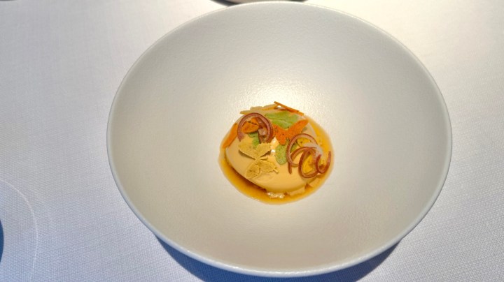 It was a great pairing for the North Sea Crab with red curry and Myoga. Myoga is Japanese ginger, so this dish combined both Japanese and Thai influences. The yellow, red, and green “leaves” on top represent the three main types of Thai curries. The dish had all the complexity of a high-quality red curry but with only a hint of chili heat, ensuring the curry did not overpower the gentle sweetness of the crab.