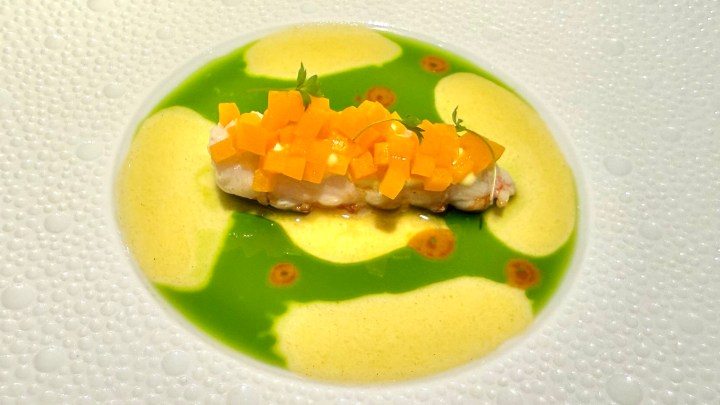 The langoustine was perfectly prepared, seared on one side while remaining barely cooked on the other, and topped with crunchy pickled squash cubes. The Markoesa and lovage provided vibrant yellow and green accents on the plate, while small drops of a rich langoustine bisque added further depth of flavor.