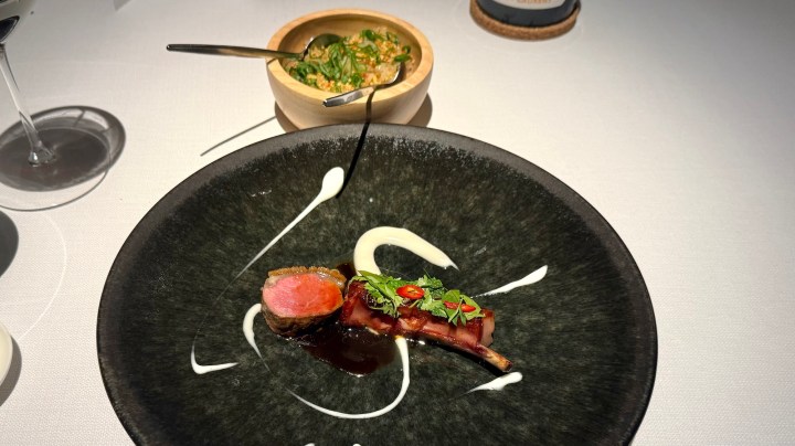 Then I saw this beautifully presented dinner – don’t laugh > a perfect food night for me! Love the room – have to think back to Venice, Rome, south of France, Hong Kong, Tokyo to remember sitting in similar places. Am going back to go thru’ the food again – cannot taste thru’ the screen but the lamb ‘both ways’ thrills methinks . . . and glad you were served a New Zealand wine amongst others . . . have quite a few foodie friends across the Ditch . . . thank you!