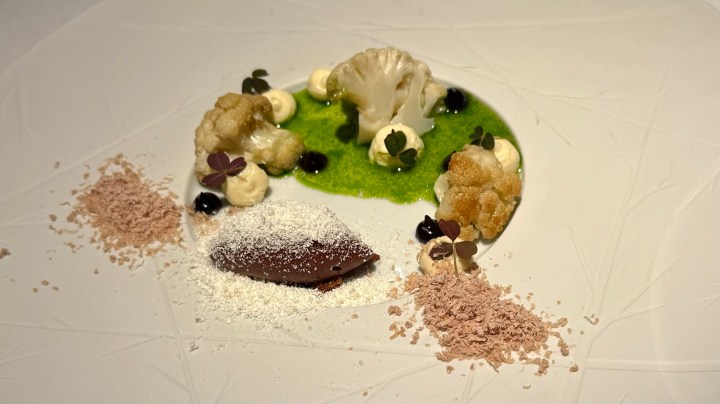 It was a perfect match for the Pierre Robert cheese served with roasted cauliflower, Kenjoer, grated frozen foie gras, and a red wine sorbet. Kenjoer is a distinct type of aromatic ginger frequently used in Surinamese and Indonesian cuisine. This was far more than just a selection of cheese with accompaniments; it was a fully realized, complex dish where the cheese served as an integral element of the composition.