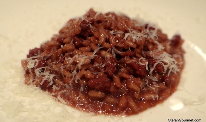 And now for today’s recipe. Yesterday evening was the first serata piemontese, and it was a great success. Tonight is the next installment, with the same food but mostly different wines. I will do a full report in a later post. I included two primi piatti in my Piemontese menu: agnolotti and risotto al barolo con salsiccia. Risotto is usually made with just a bit of white wine, but Piemonte has the speciality of using red wine and quite a lot of it so the main flavor of the risotto is that of the wine. The end result will thus depend on the quality of the wine used, and though it may seem like a waste of a good barolo, I strongly urge you not to use a cheap red wine for this as that would ruin the dish. Last night everyone agreed that this risotto was different, but delicious. Continue reading “Risotto al Barolo con Salsiccia”