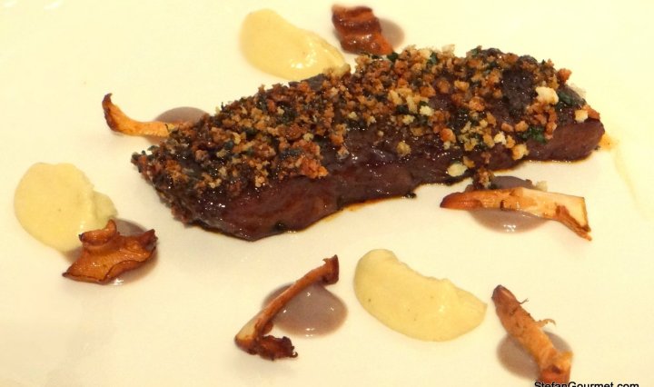 For me the main success of this dish was the crust. The wagyu flank steak was very tender and flavorful because it had been cooked sous-vide, and had additional flavor because it was finished on a charcoal grill. The tender beef was complemented very nicely by the crunchy parsley crust. The combination with the mushroom ketchup, mushrooms, and the garlic puree also worked very well. Continue reading “Parsley-Crusted Steak with Mushroom Ketchup and Garlic Puree”