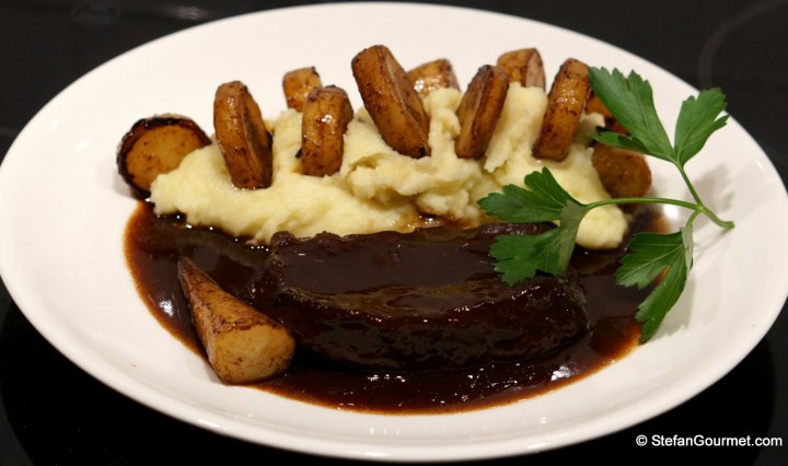 The dish I prepared can be made with or without sous-vide. With sous-vide cooking, a flat iron steak or other types of beef that are usually braised, can be cooked for 24-72 hours at 55-57ºC/131-135ºF to obtain the texture of a tender steak cooked to medium rare. I’ve very rarely used sous-vide to get the texture of a traditional braise. Exceptions have been duck confit and pulled pork. This is the first time I’ve prepared draadjesvlees sous-vide. I cooked it for 5 hours at 88ºC/190ºF. The result was comparable to a good traditional braise on the stovetop. The advantage is that there is less margin of error.