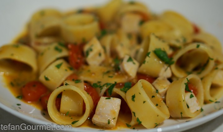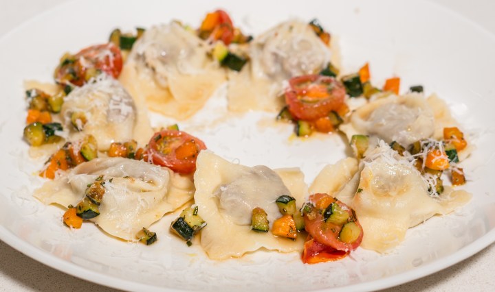 As part of our wine tour through Friuli, we had dinner at La Subida Trattoria al Cacciatore. The chef’s specialty is girini—his interpretation of a traditional local dish made by letting pasta batter drip into boiling water to form fresh pasta. What … Continue reading Girini (Crumbles of Dropped Pasta) with Rabbit, Samphire, and Cherry Tomatoes