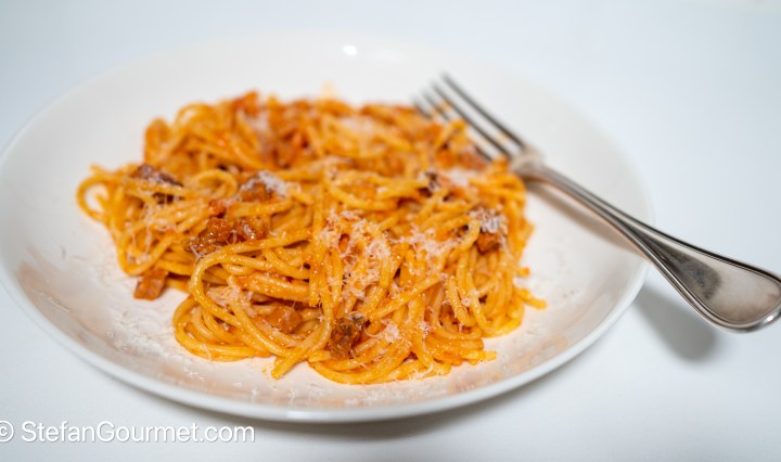 I had not blogged about alla Gricia yet, which is also known as Amatriciana ‘in Bianco’ because it is the same as Amatriciana but without the tomatoes. The recipe for alla Gricia is very simple: spaghetti, guanciale, pecorino romano, salt, and black pepper. It is not only very simple but also very tasty! Continue reading “Spaghetti alla Gricia”