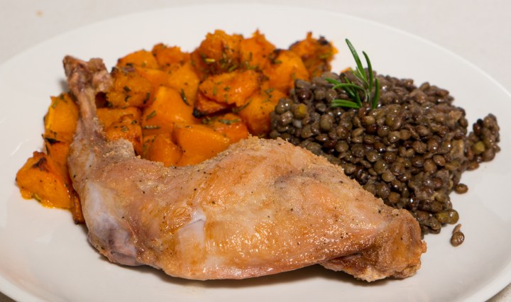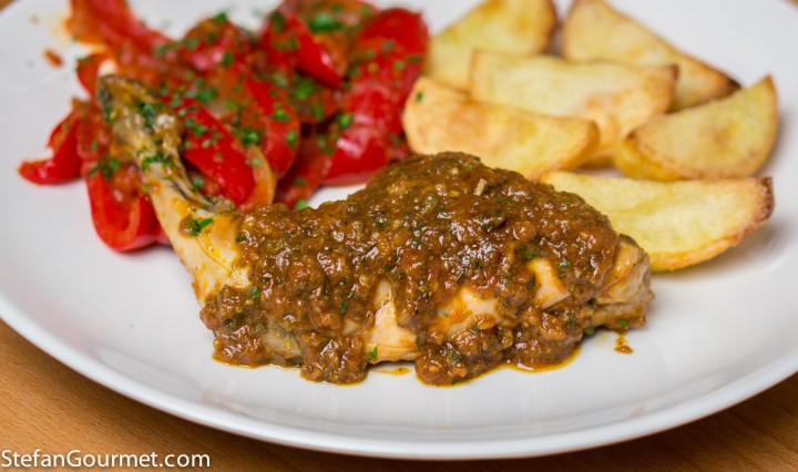 Cuts of meat that come from different muscle groups in an animal require different cooking to make them shine. For instance, a ribeye steak is best served medium rare after a quick sear and some resting, whereas a brisket needs to be cooked low and slow to become tender and delicious to eat. Smaller animals like chickens and rabbits are often cooked whole, disregarding the wisdom gained from preparing beef in separate parts. Part of the reason for this may be that a chicken fits easier into most pans and ovens than a whole cow does 😉 A more economical reason is that if you judge by effort per pound of meat, a relatively big effort is needed to separate the different muscle groups of a small animal. Even so, it is worth doing so to get the best results. This is also true for rabbit. Rabbit loins are the ‘rib eye’ of the rabbit, they are very tender and require very little cooking. The legs and other parts however need to be braised or stewed. Even so, rabbit is often cooked whole with the loin dried out.
