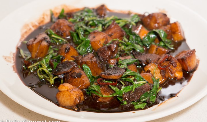 The inspiration for this risotto came from our wonderful dinner at De Librije, where the sea scallops with veal marrow, black garlic and a smoky jus of roasted celeriac was one of our favorite dishes. This is by no means my version of the same dish, I mainly used the idea of pairing scallops with smoky celeriac. At De Librije the dish was paired with a white burgundy from Cotes-de-Nuits, and I also happened to have one bottle of a white Cotes-de-Nuits 2006 left so we drank that with it (and I also used one glass for the risotto). Ingredients … Continue reading Smoked Celeriac Risotto with Scallops