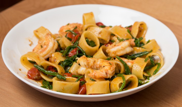 Spaghetti V.G.P. (Spaghetti with Vongole, Shrimp, and Pistachios)
